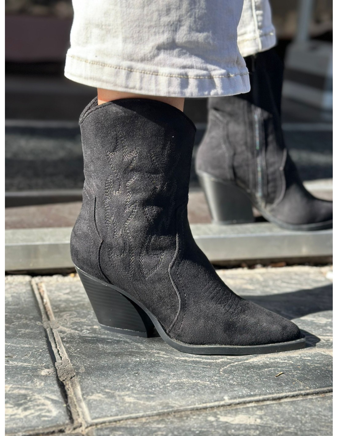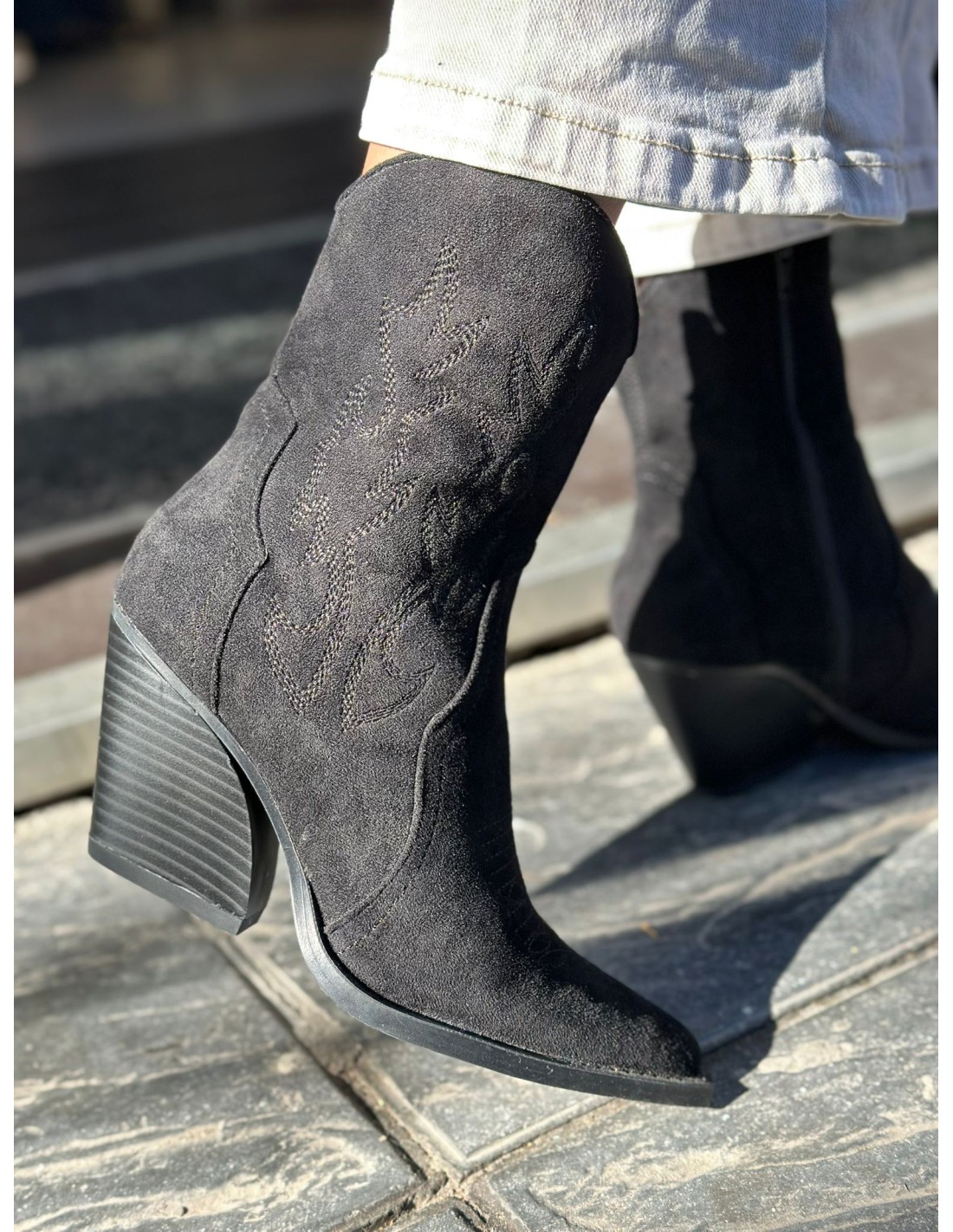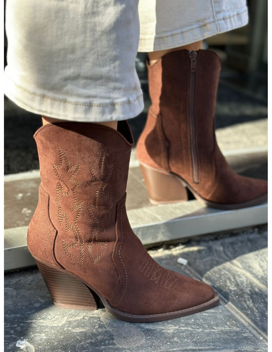 Estas elegantes botas marrones negro y kaki de estilo vaquero destacan por su acabado en gamuza suave y su detallado bordado decorativo, que aporta un toque artesanal irresistible. Su tacón ancho y cómodo ofrece una excelente estabilidad sin sacrificar altura ni estilo. El diseño incluye una silueta estilizada con punta ligeramente afilada y cierre lateral, lo que facilita su uso diario. Son perfectas para elevar cualquier look casual, desde jeans hasta vestidos, aportando carácter y un aire moderno con inspiración western.