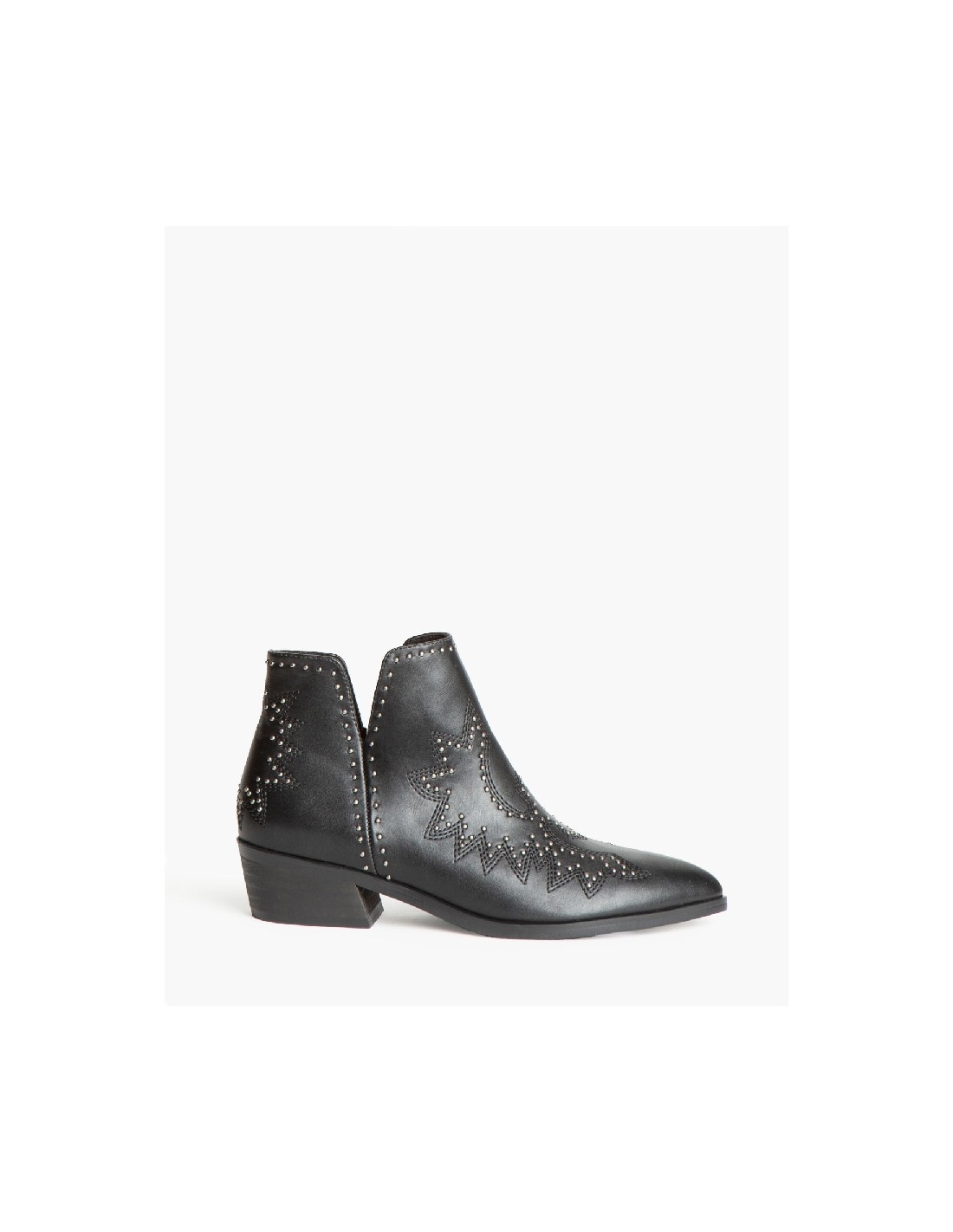 Estos botines, disponibles en elegante negro, son la declaración de estilo que buscabas. Confeccionados en piel lisa, destacan por su puntera afilada y un diseño cowboy modernizado. El detalle de remaches metálicos crea un patrón único y lleno de carácter, mientras que el cierre con cremallera en el lateral interior facilita su calce. El tacón bajo y ancho añade un toque de altura sin sacrificar comodidad, haciendo de este calzado la opción perfecta para darle un giro audaz a cualquier atuendo.