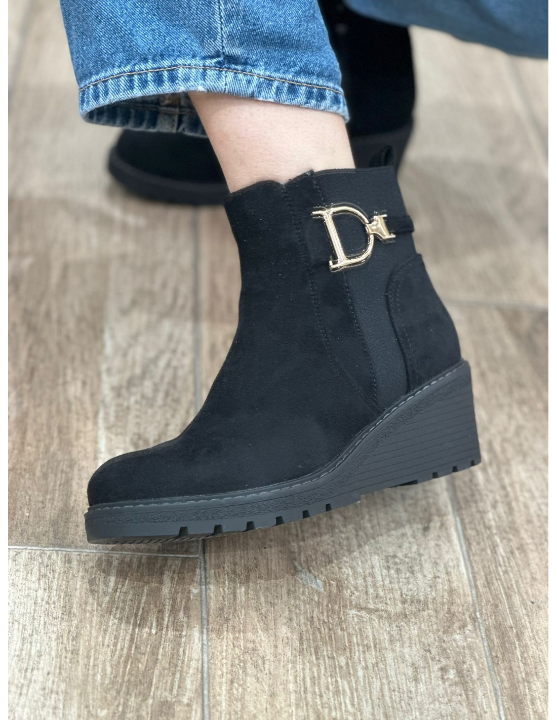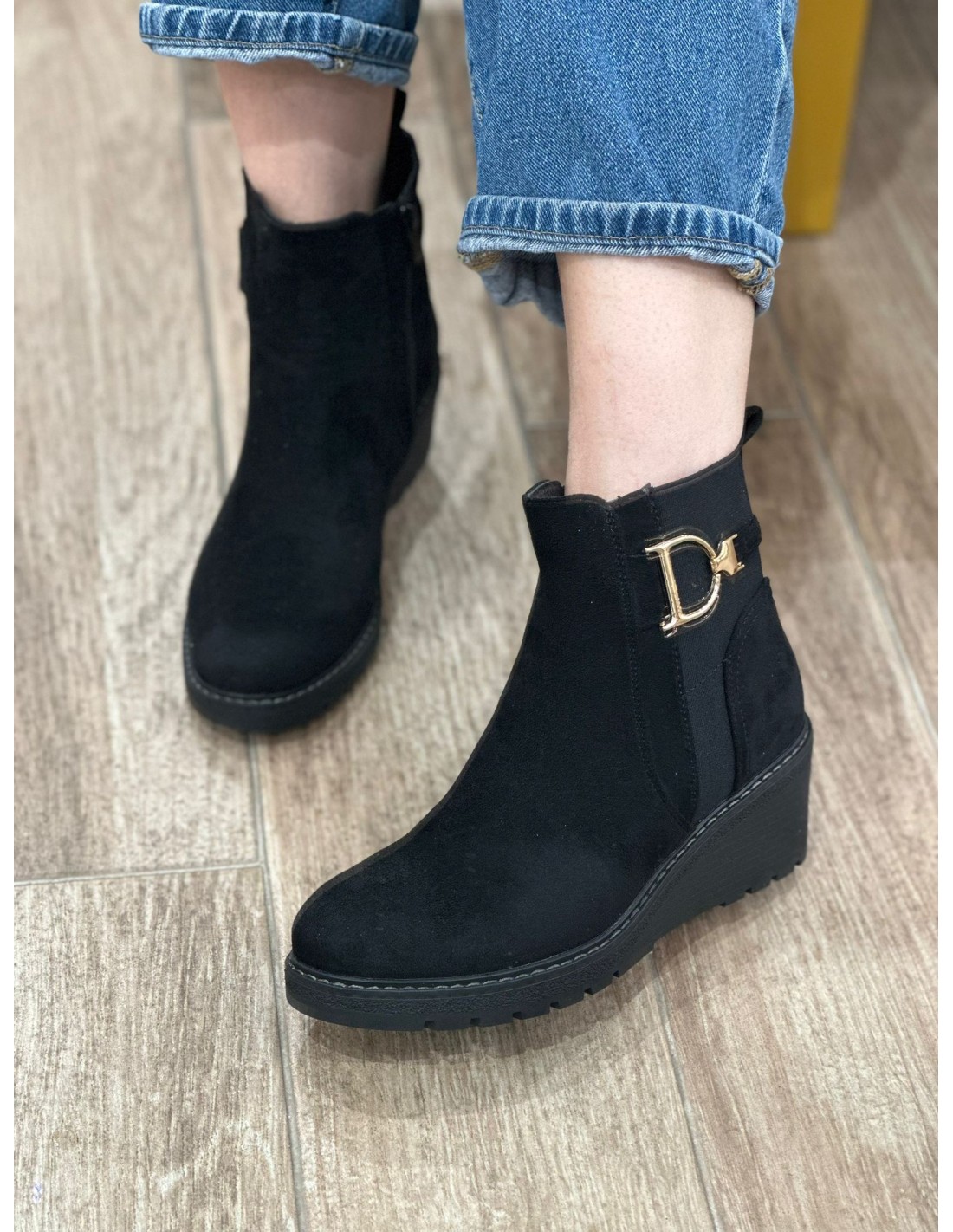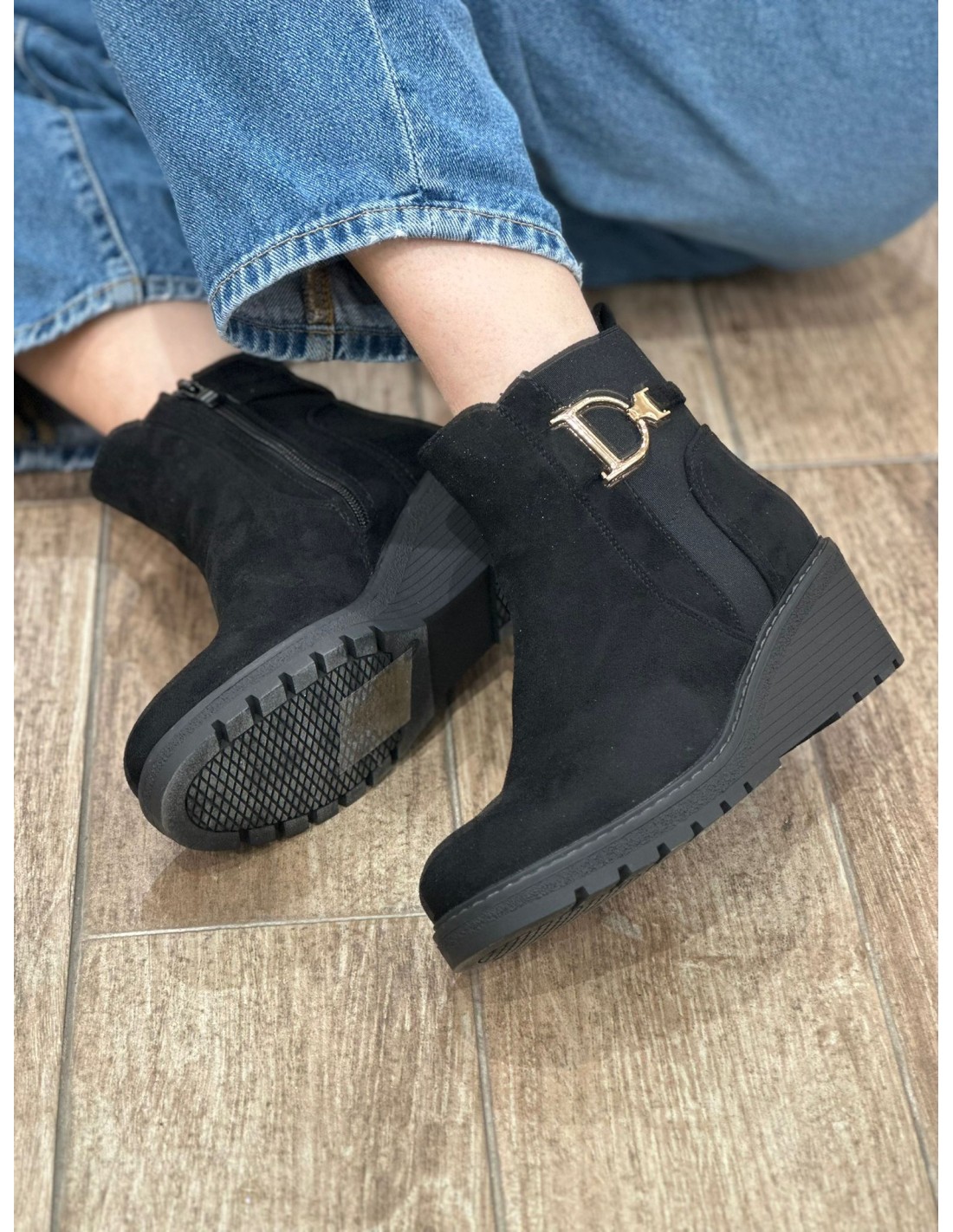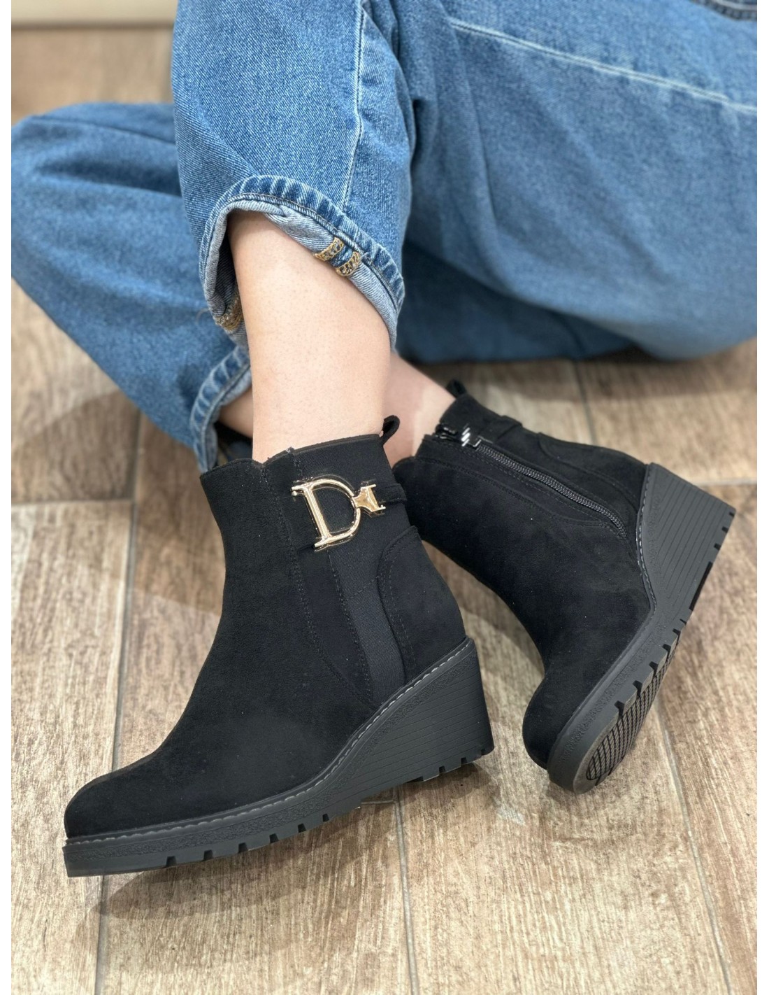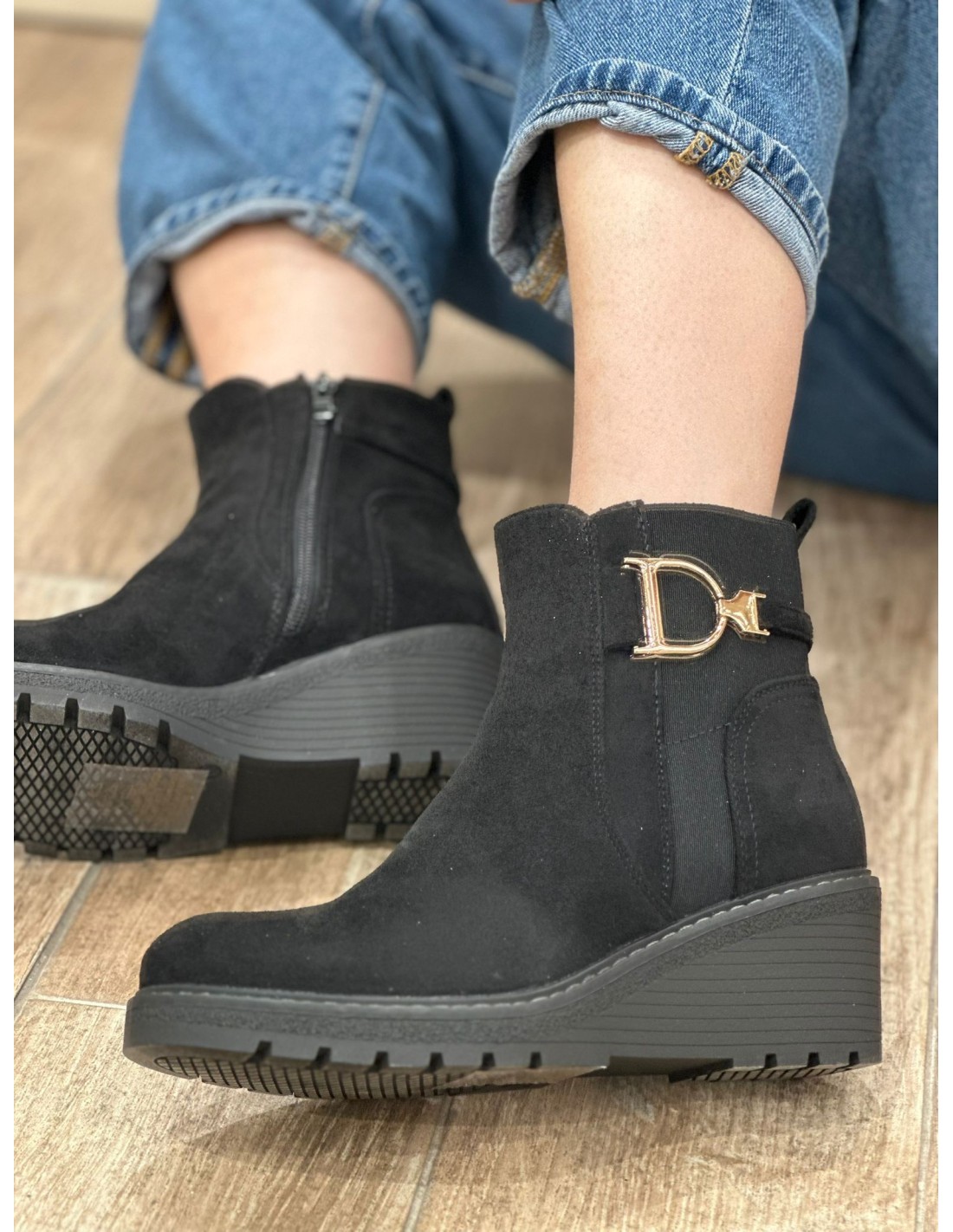 Combina estilo y comodidad sin esfuerzo con estos botines de cuña con plataforma. Su diseño elegante y funcional presenta un acabado de gamuza, un tacón de cuña que estiliza la figura y una suela de plataforma robusta y antideslizante, perfecta para caminar con confianza. El detalle de hebilla dorada con forma de 'D' en la parte exterior añade un toque de lujo y sofisticación.