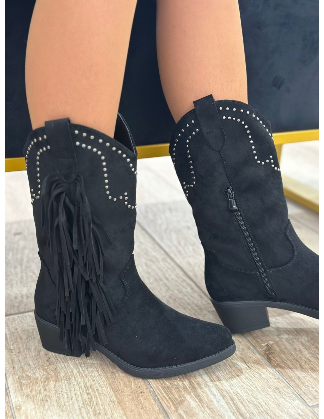 Botas media caña con flecos y tachuela en la parte de arriba estilo cowboy , en su interior lleva su correspondiente cremallera.