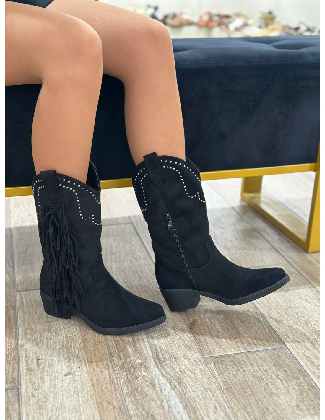 Botas media caña con flecos y tachuela en la parte de arriba estilo cowboy , en su interior lleva su correspondiente cremallera.