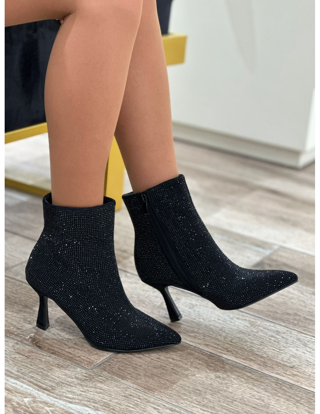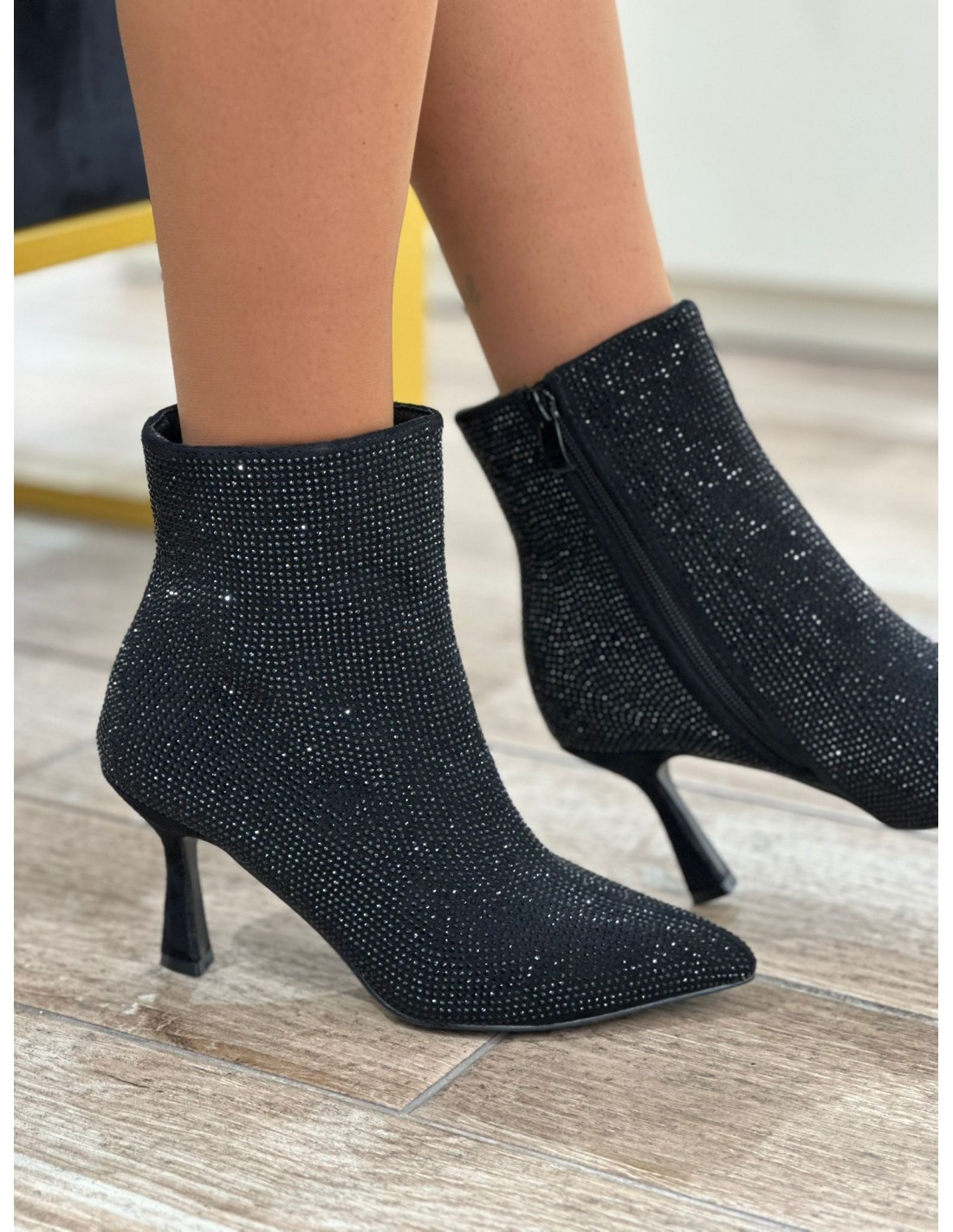 Dale un toque de glamour a tu look con estos espectaculares botines negros. Su diseño ajustado al tobillo estiliza la figura, mientras que los finos destellos incrustados en todo el calzado aportan un brillo sutil y sofisticado.