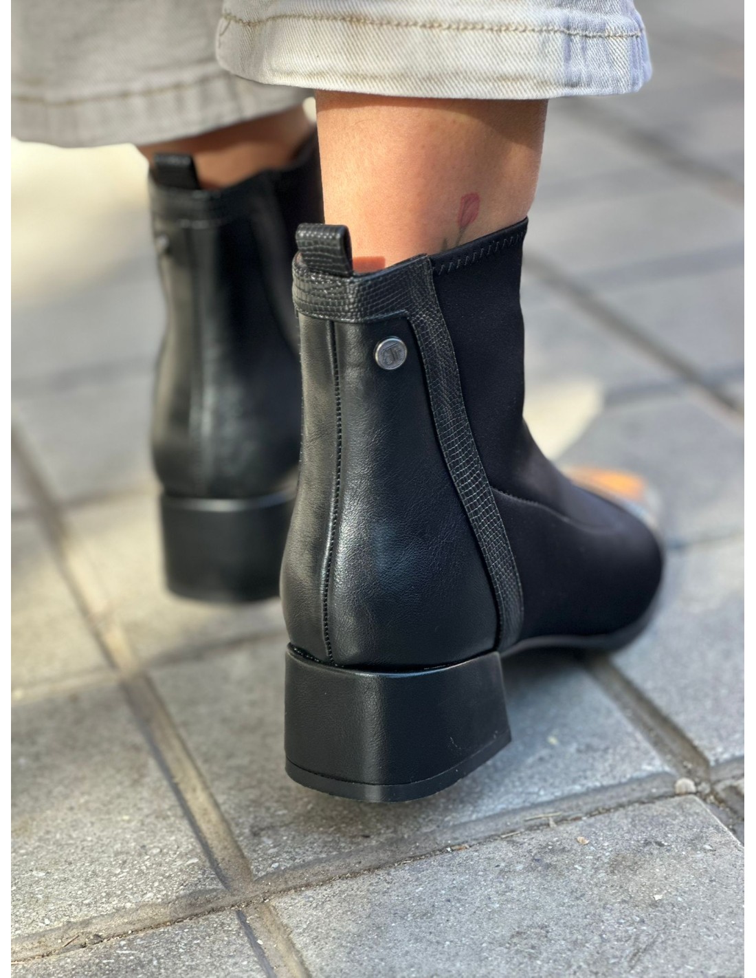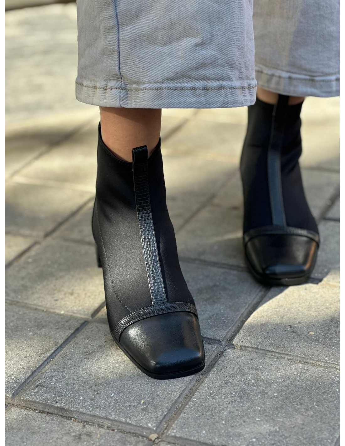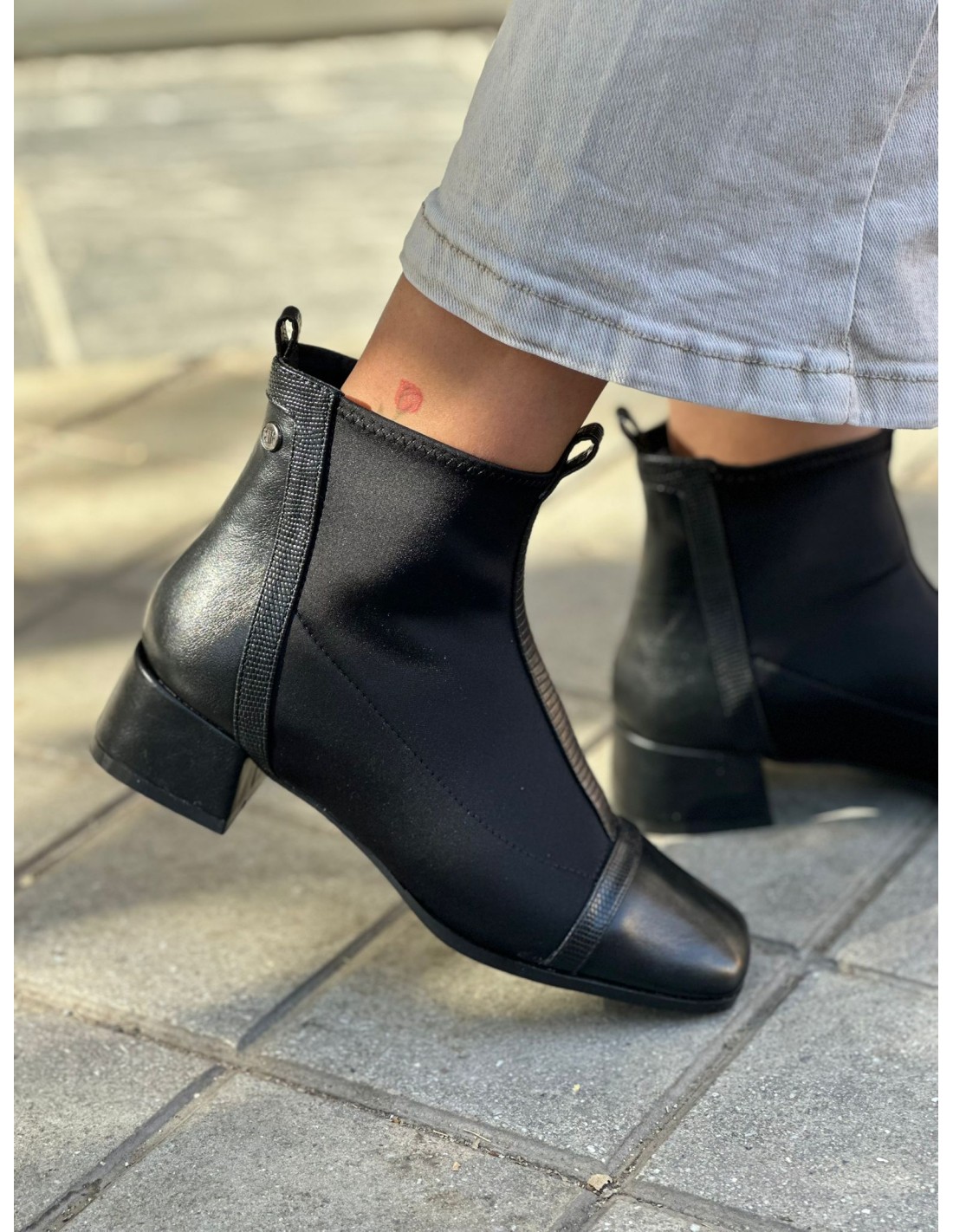 Botines bicolor cavar en punta cuadrada, tacon bajo sin cremallera pero con licra para que sea facil de poner, ajustado al pie. Ademas incliye una suela que no resvala.