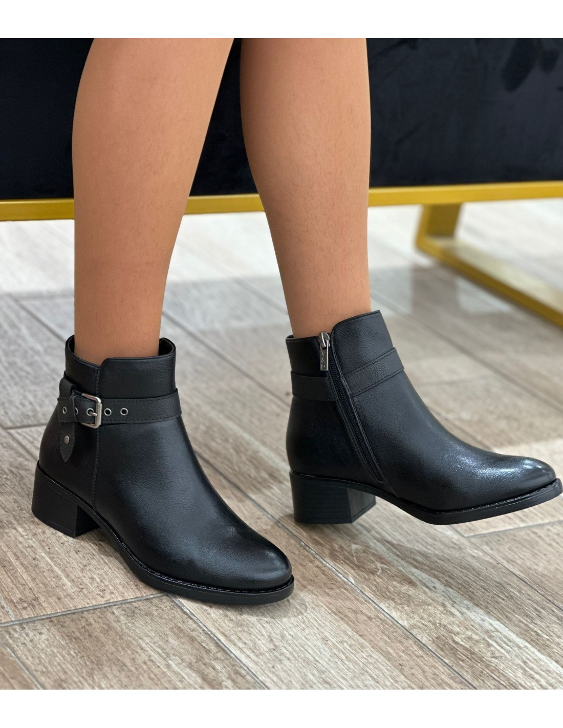 Estos botines cafés destacan por su estilo moderno y versátil, perfectos para combinar con cualquier atuendo diario. Su diseño incluye un cierre lateral para poner y quitar fácilmente y una correa decorativa con herrajes metálicos que aporta un toque elegante. Con su tacón bajo y cómodo, son ideales para caminar todo el día sin perder estilo.