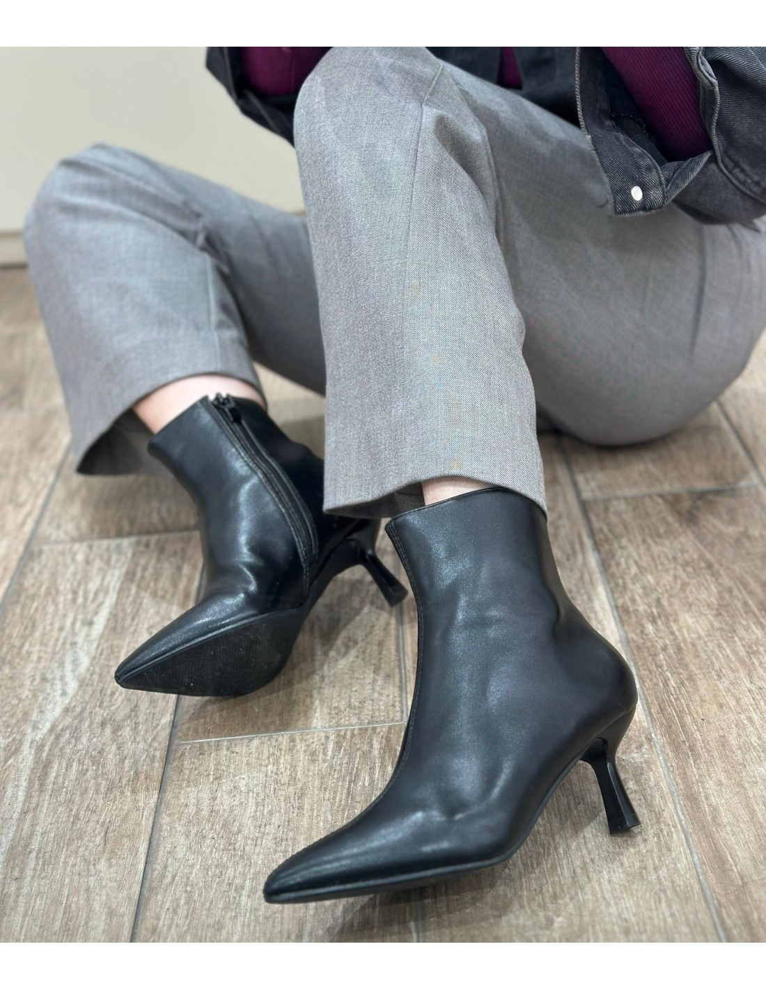 Estos botines de tacon bajo combinan comodidad y sofisticación a la perfección. Fabricados en un acabado negro liso y de aspecto moderno, presentan una silueta estilizada con punta afilada que realza cualquier outfit. Su tacón delgado aporta altura sin sacrificar estabilidad, ideal para usar durante todo el día.