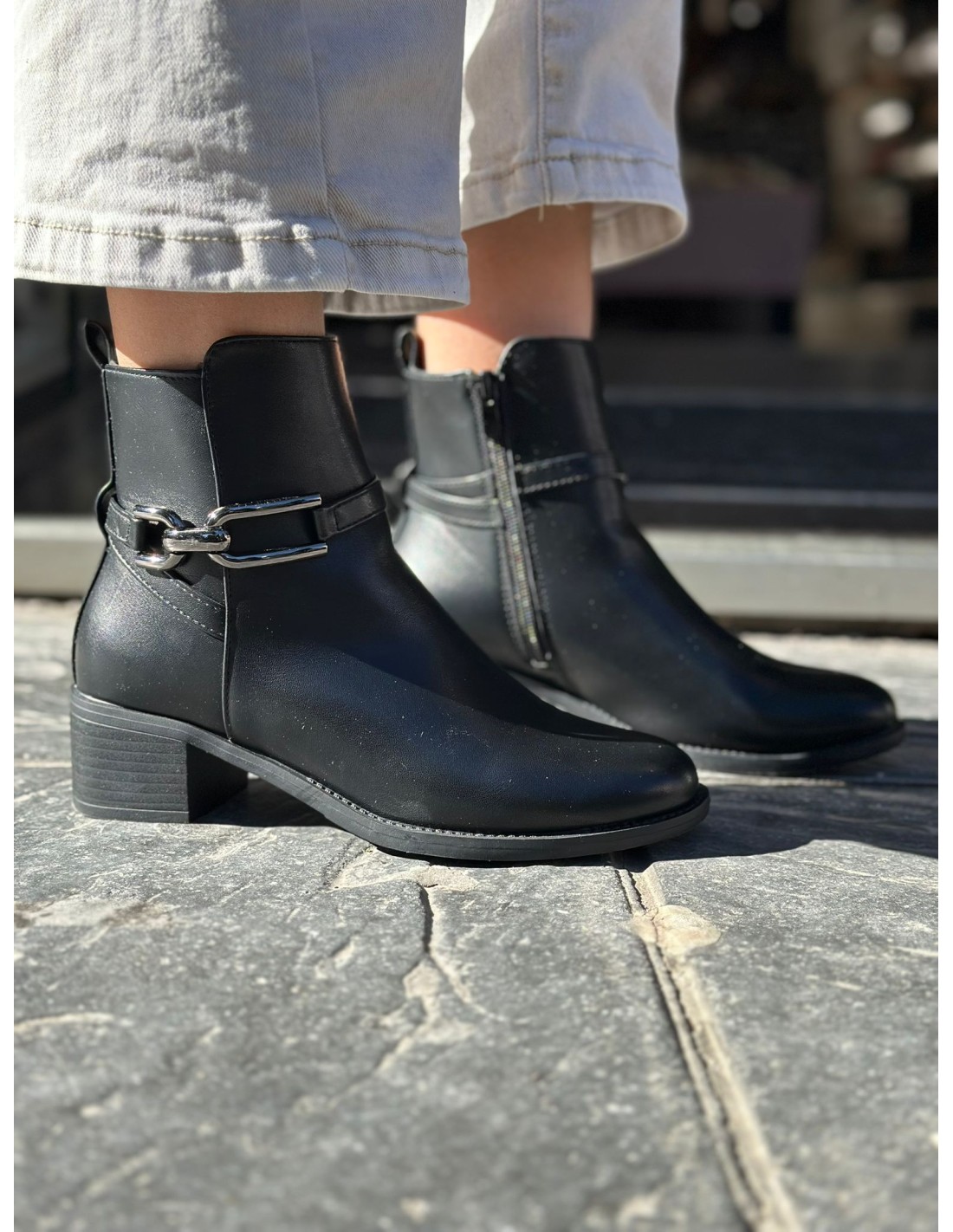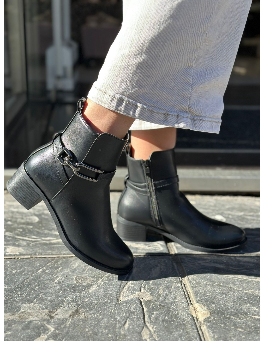 Estos botines negros combinan un estilo sofisticado y versátil, ideales para el día a día o para looks más formales. Su acabado en material liso y resistente los hace elegantes y fáciles de combinar, mientras que el detalle metálico lateral añade un toque distintivo y actual. Cuentan con un tacón bajo y cómodo, además de cierre lateral para mayor practicidad. Son una opción perfecta para quienes buscan calzado funcional, moderno y con un toque de elegancia sutil.
