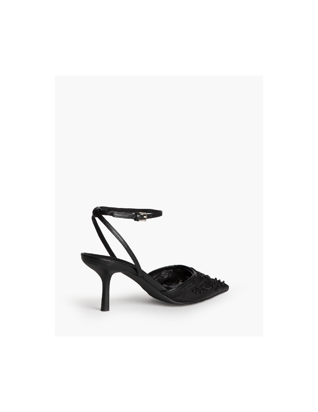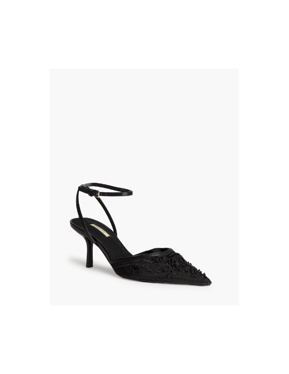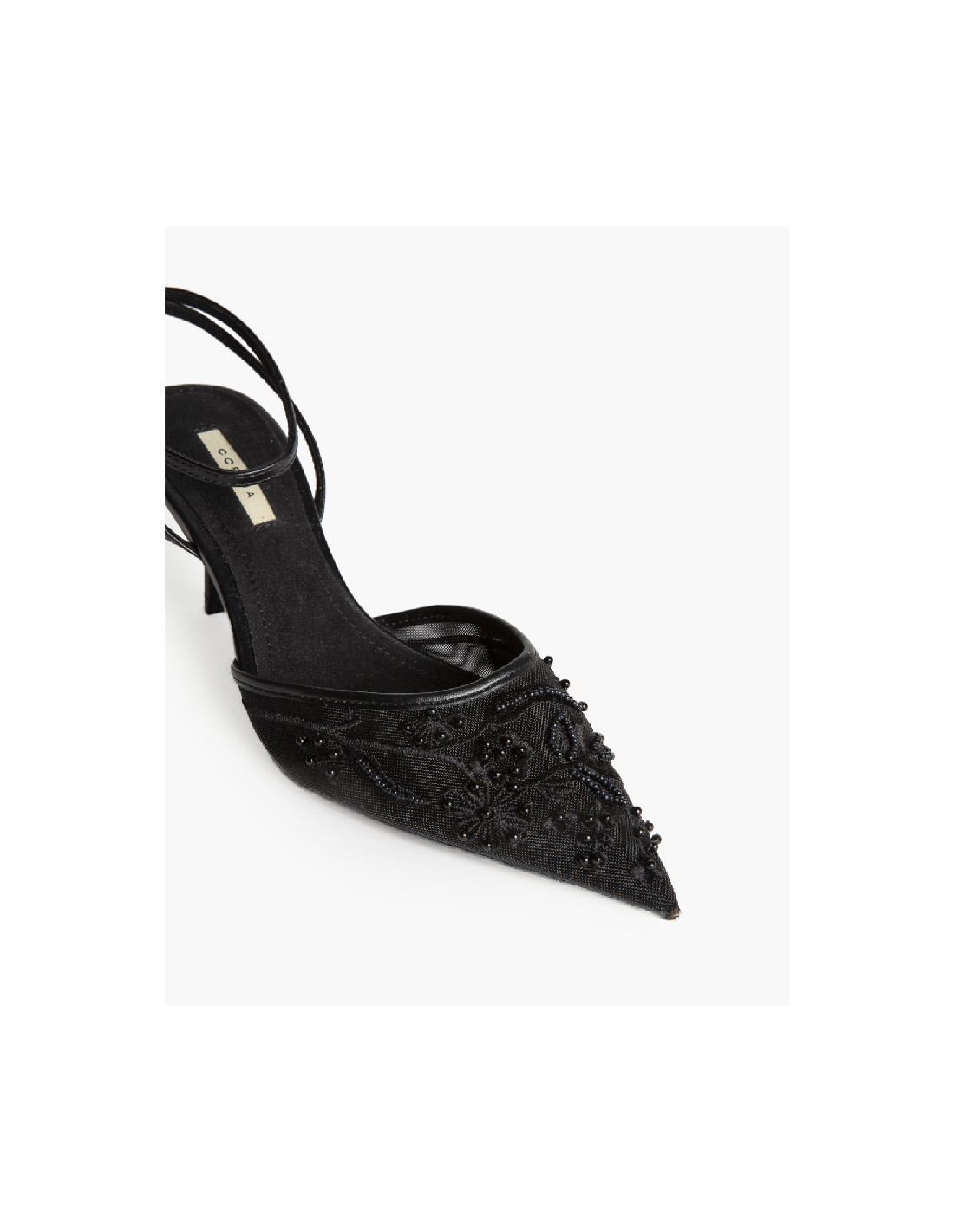 Acabado en punta, detalle de bordado con abalorios en el corte.
