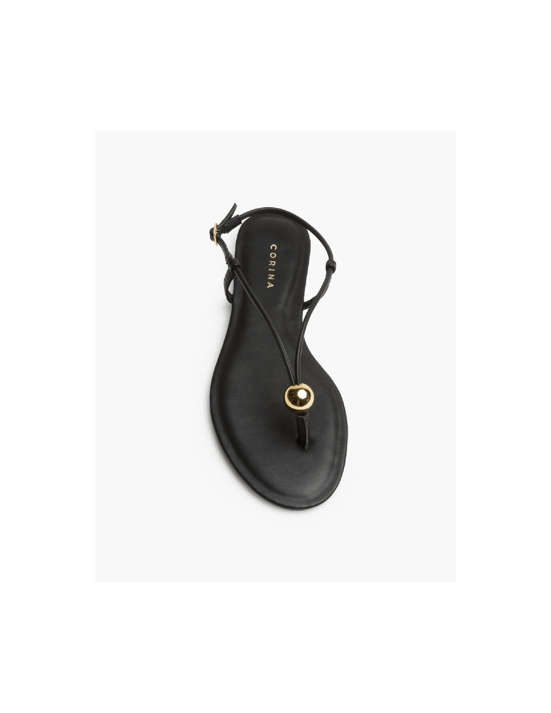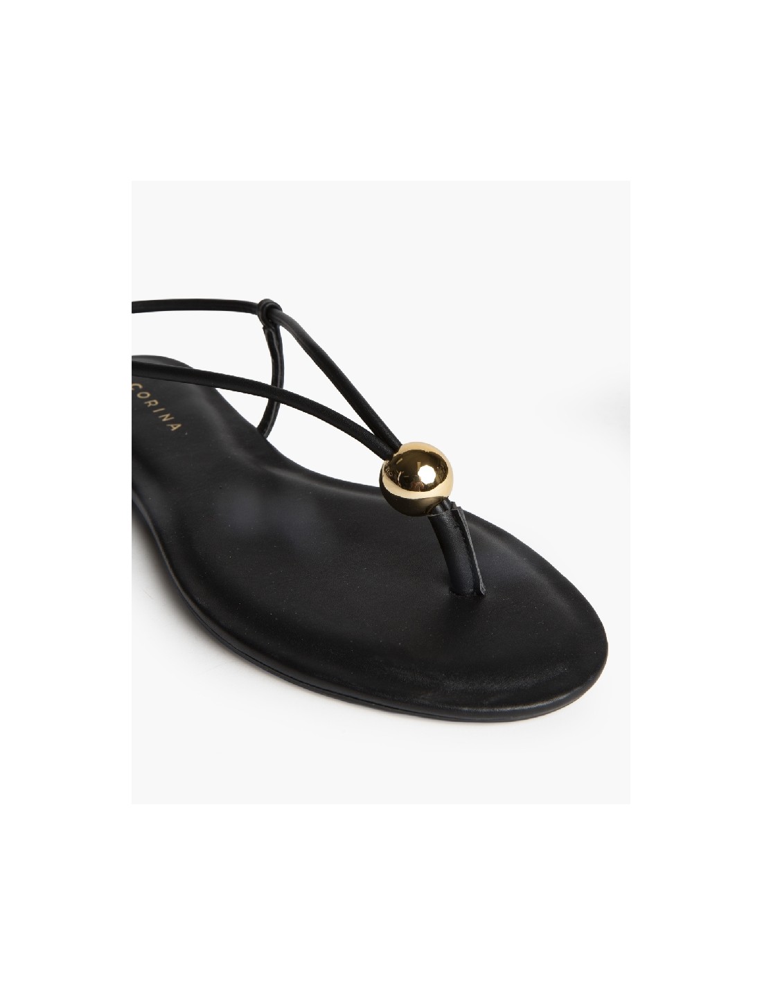 Sandalia plana con plantilla acolchada, corte de tiras finas. Cierre mediante hebilla en el lateral exterior. Detalle metálico bola plana en la parte delantera.