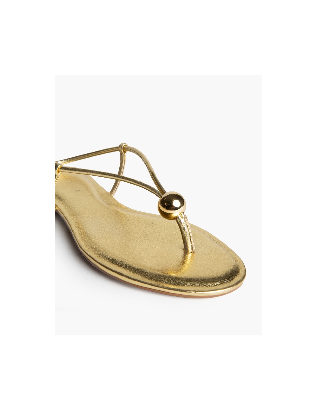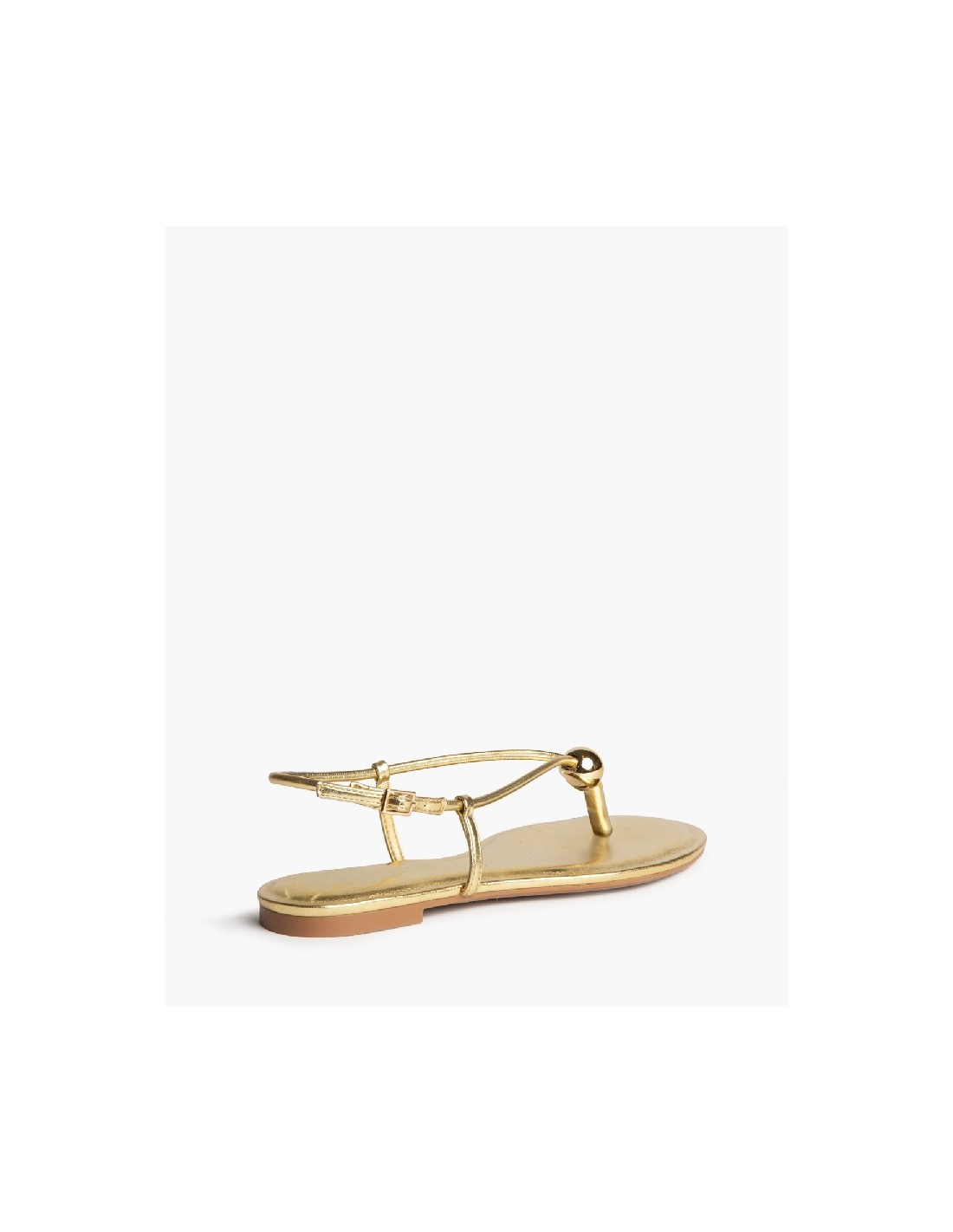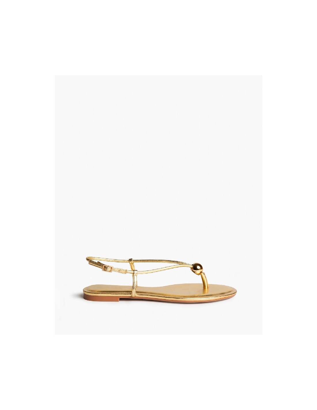 Sandalia plana con plantilla acolchada, corte de tiras finas. Cierre mediante hebilla en el lateral exterior. Detalle metálico bola plana en la parte delantera.