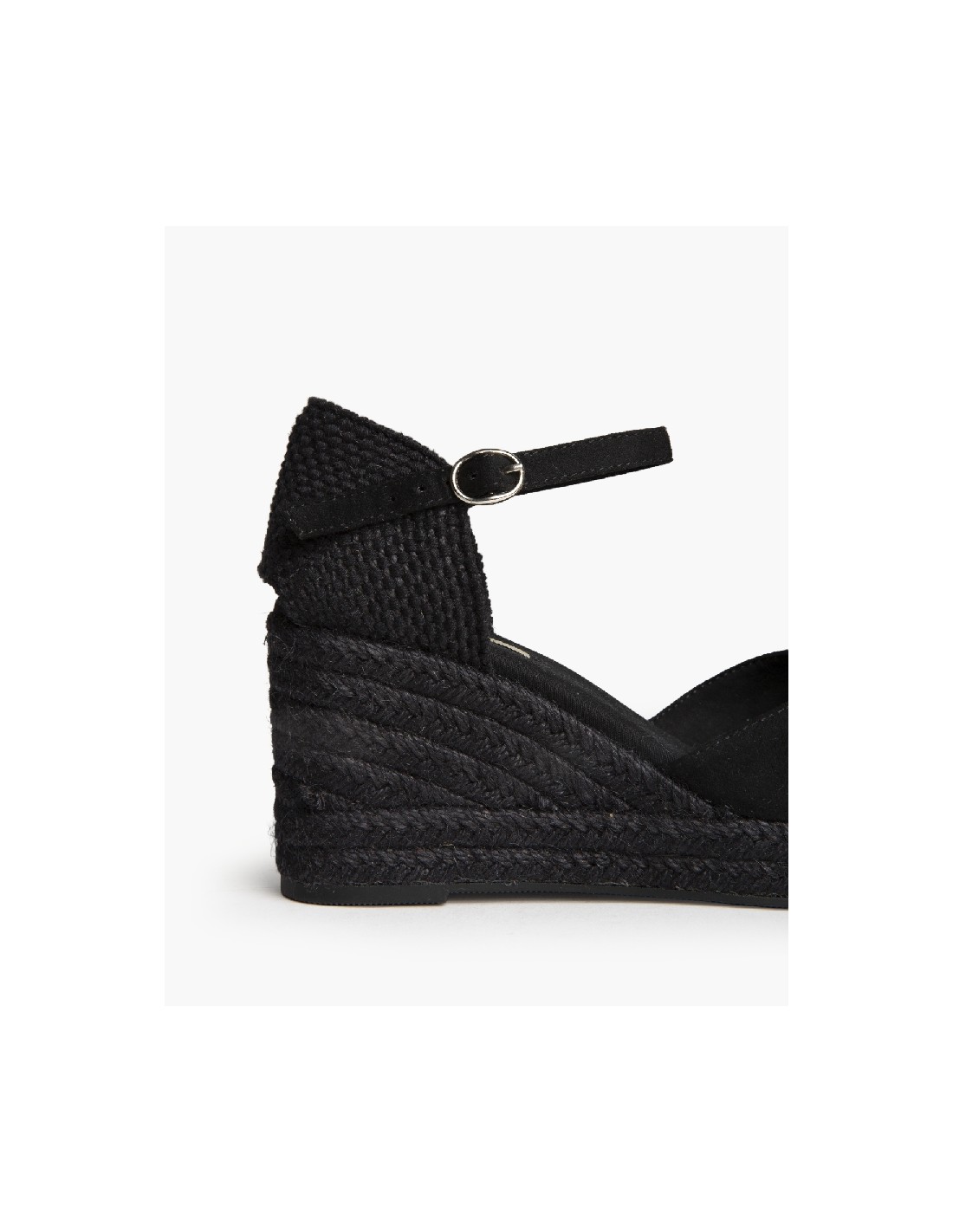 Plataforma tipo valenciana, con cuña en yute. Escote en pico. Cierre hebilla en la tira del talón.