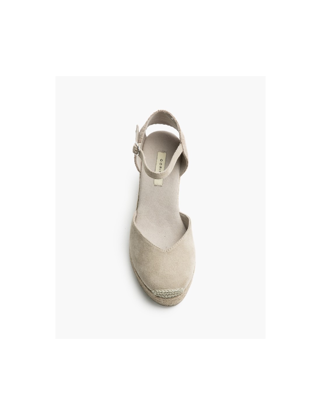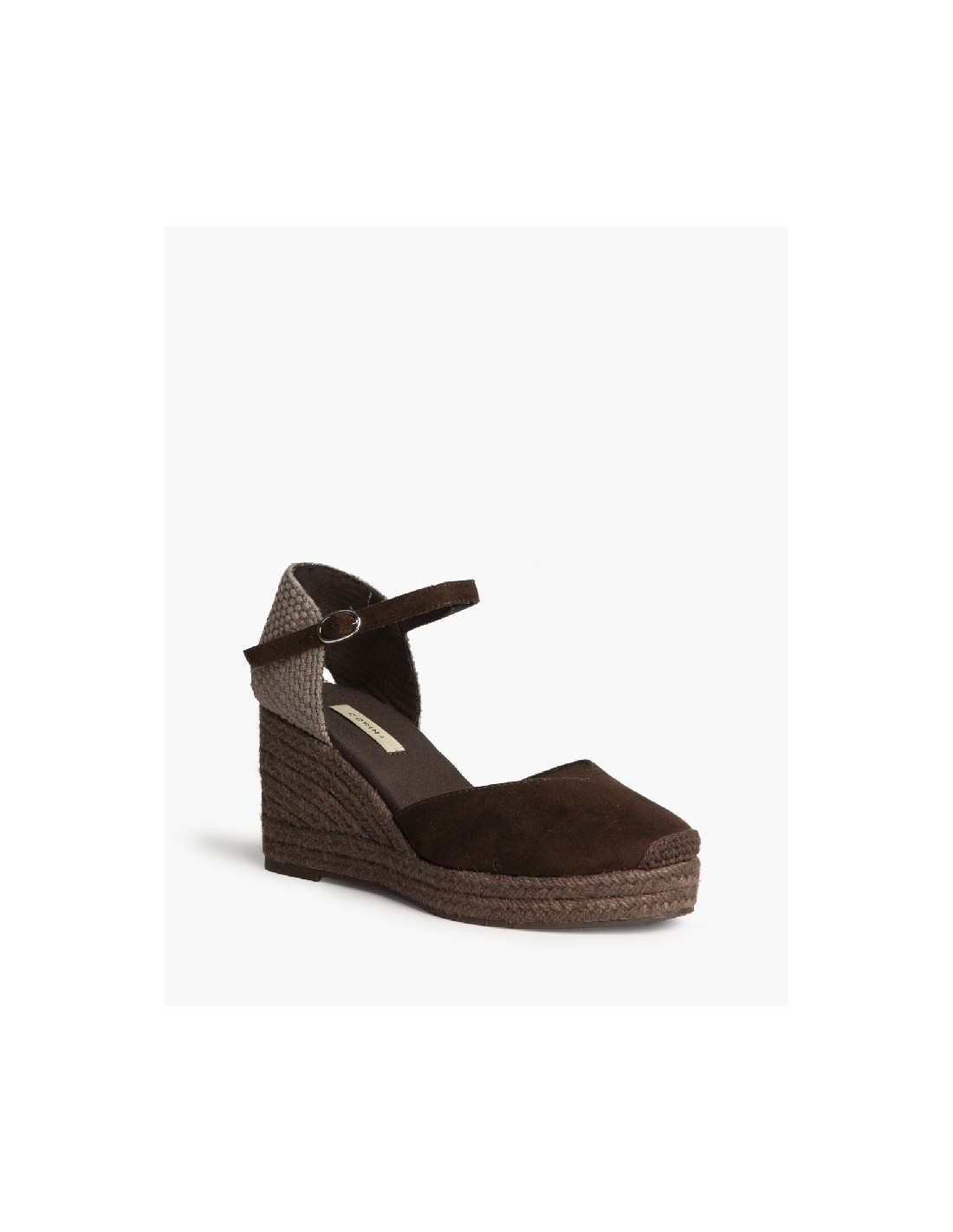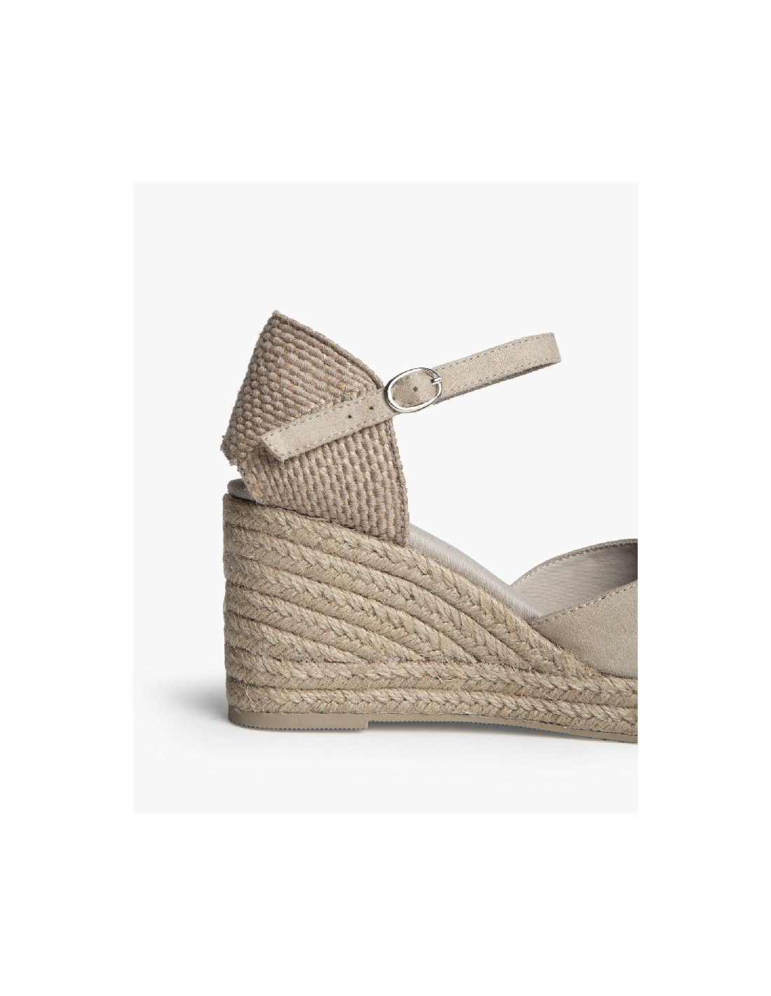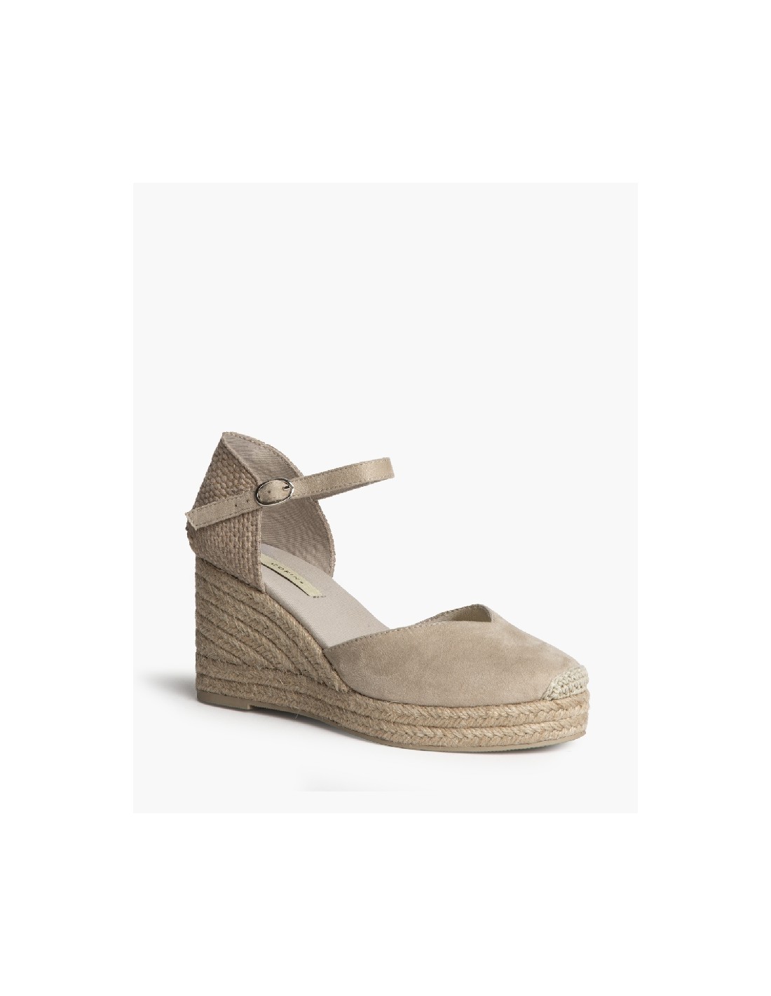 Plataforma tipo valenciana, con cuña en yute. Escote en pico. Cierre hebilla en la tira del talón.