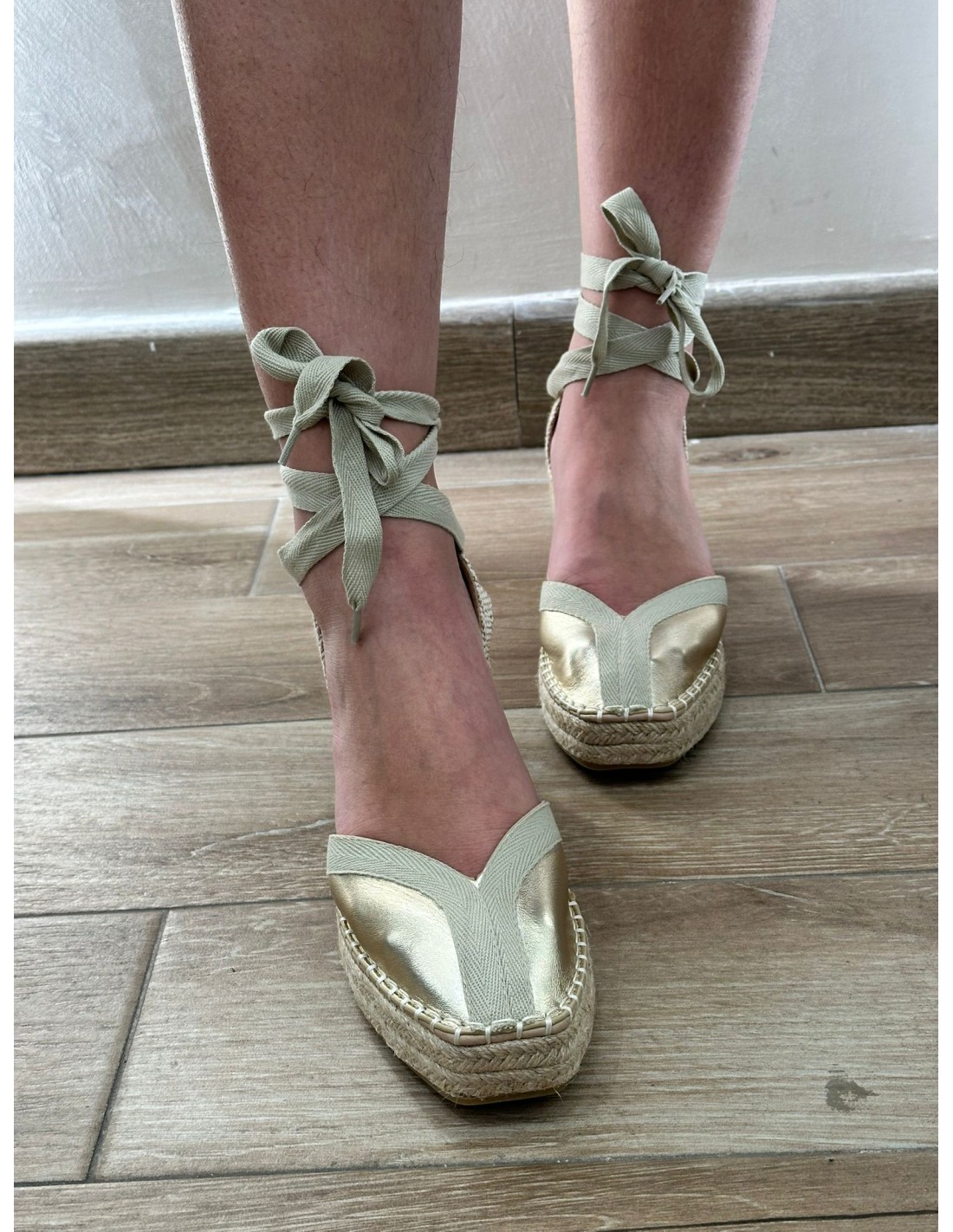 Esparto de cuña mediana y con cinta atada a tobillo