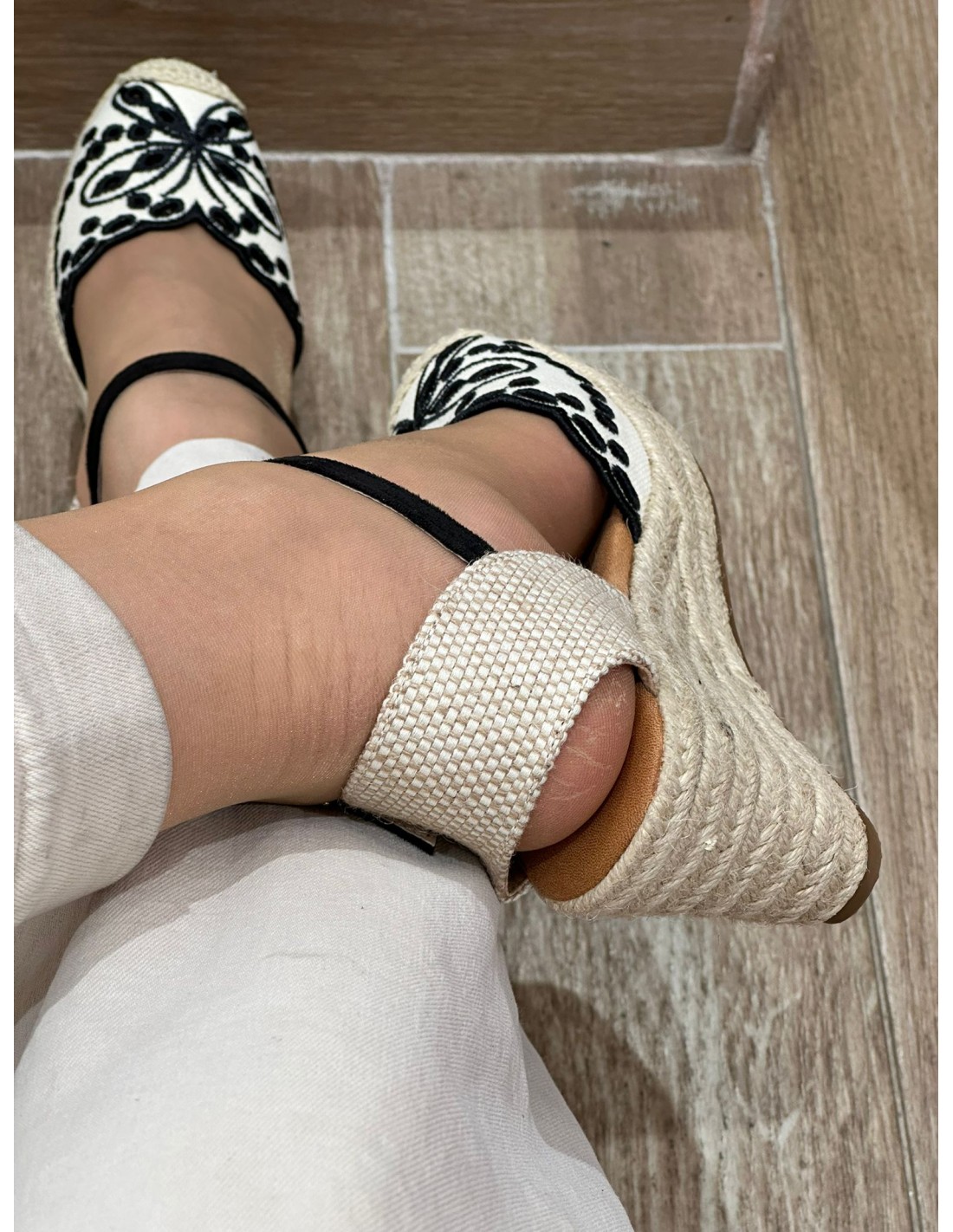 La suela de cuña de 8 cm, forrada en cuerda de yute trenzada, da un aspecto natural y veraniego. Brinda altura cómoda y facilidad de caminata.
