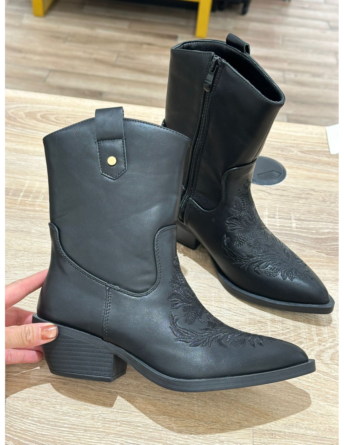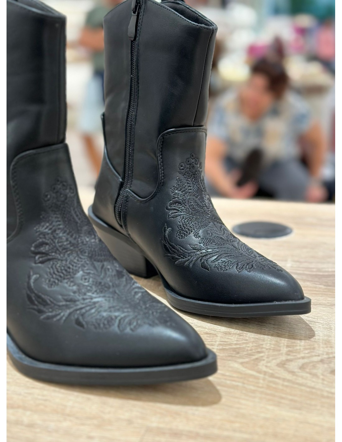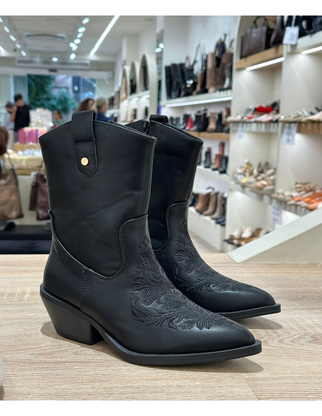 Botas Tacón Medio Corol Negros con Bordado, y Con Cremallera Lateral